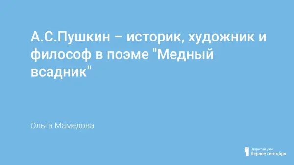 Предпосылками к созданию поэмы «Медный всадник» явилось наводнение 1824 года и несогласие с позицией польского поэта Мицкевича в отношении России и русского царя. Отрицательному отношению Мицкевича к Петру I Пушкин противопоставил свое, объективное: царь предстаёт мудрым, смелым и жестоким. Художественный мир поэмы является «ключом» к разгадке идейного замысла этого уникального произведения. Поэма имеет глубокий философский смысл: противоречия между человеком и властью не могут разрешиться или исчезнуть: человек и власть всегда связаны между собой, и одно явление без другого существовать не может. Между двумя «правдами» — правдой власти и правдой частного человека должна стоять высшая истина, основанная на человечности, любви и уважении.