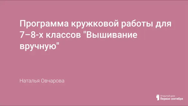 Настоящая программа составлена для кружковой работы по изучению вышивки, знакомству с профессией вышивальщицы вручную. Ориентирует учащихся на получение данной профессии. Основной формой обучения является практическая работа. Она позволяет приобрести и совершенствовать основные умения и навыки необходимые при вышивании. Учит оформлять вышивкой предметы декоративно - прикладного характера.