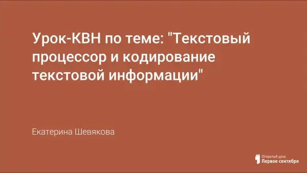 Текстовый процессор и кодирование текстовой информации - одна из ключевых тем школьного курса "Информатики". Для закрепления темы "Текстовый процессор" я предлагаю провести урок - КВН, в котором проверяются все основные навыки работы в Word. Урок по кодированию текстовой информации предлагаю совместить с темой "Символьные переменные", как наиболее удобный переход к изучению этого раздела.