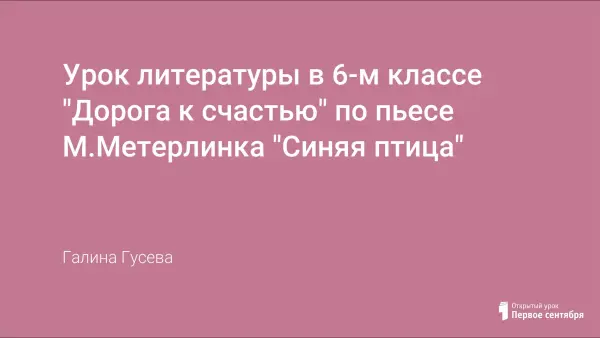 Урок литературы в 6-м классе по пьесе М.Метерлинка "Синяя птица" рекомендуется как урок внеклассного чтения в период новогодних праздников. Красочность оформления урока, инсценирование, просмотр кадров фильма, игры на знание текста и размышления учеников о счастье, смысле жизни способствуют высокой результативности усвоения материала, повышают интерес учеников к урокам литературы.