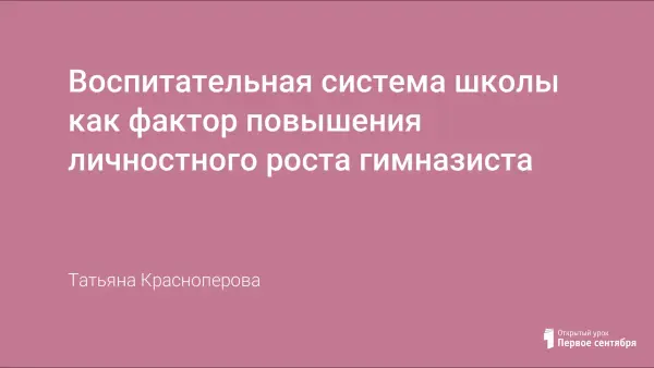 В статье показаны основополагающие ориентиры, способствующие формированию личности в школе 1, 2, 3-й ступени в соответствии с ведущими документами данного учебного заведения - концептуальными основами программы развития и образовательной программой гимназии. Предлагаемый материал позволяет понять важность и необходимость создания воспитательной системы школы как ведущего фактора, способствующего повышению личностного роста гимназиста, а также освоить некоторые этапы построения воспитательной системы в конкретном образовательном учреждении.