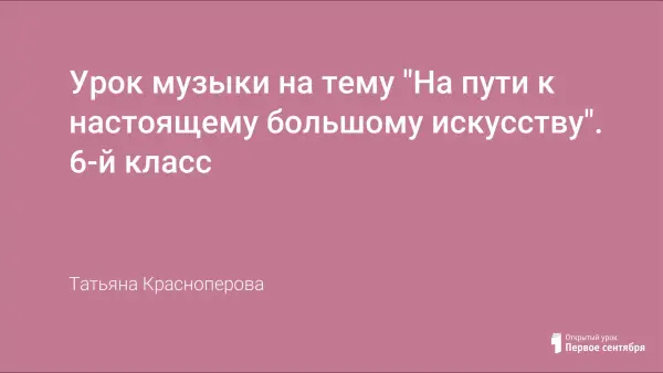 Разработанный урок для учащихся 6-го класса представлен как путь вхождения в настоящее большое искусство. Им предлагается погрузиться в мир глубоких мыслей и человеческих чувств. Вхождение в мир прекрасного осуществляется обучающимися на примерах высокохудожественных образцов мирового музыкального искусства. Разработка урока предназначена для учителей-практиков, студентов музыкально-педагогических факультетов высших и средних профессиональных учебных заведений.