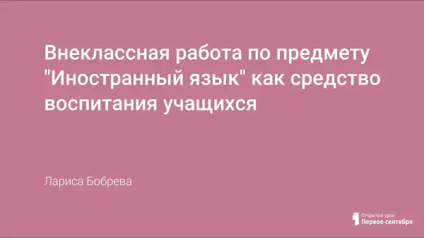 Цель статьи "Внеклассная работа по предмету "иностранный язык" как средство воспитания учащихся" - раскрыть возможности системы внеклассной деятельности в решении воспитательных, коммуникативных и общеобразовательных задач. Внеклассная работа способствует развитию самостоятельности учащихся, является важным средством всестороннего воспитания молодежи, содействует общему культурному развитию учащихся. В работе описан опыт МОУ СОШ № 107 г. Челябинска в организации и проведении Недели иностранных языков.