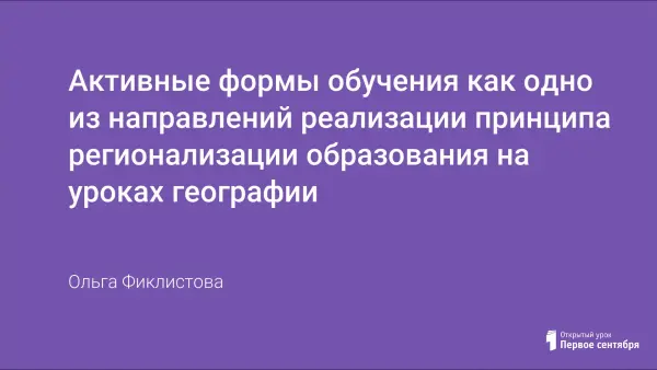 Региональная политика в образовании сложна, потому что она должна обеспечить сохранность единства российского образовательного пространства и развитие образовательных комплексов в регионе. В данном случае концептуальный подход исходит из целесообразности выделения из общей системы социального формирования личности детей, отражающей глобальные, универсальные процессы её развития, подсистемы, которая обуславливает индивидуальность, самобытность личности на уровне её мироощущения, самосознания, культуры, поведения. В её основе лежат частные, уникальные, не повторяемые в других регионах особенности территории, природы, социального обустройства, культуры. Одним из направлений реализации принципа регионализации образования на уроках географии, развития интереса к своему геокультурному пространству являются активные формы обучения.