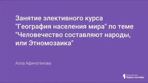 Занятие элективного курса «География населения мира» решает две главные задачи: доказывает, что каждый народ – это испытание особого образа жизни, слагающегося из законов и морали, из искусства и всего того, что мы зовём национальной культурой, и что несмотря на глобализацию стремление стран и народов к самоопределению не угасает.