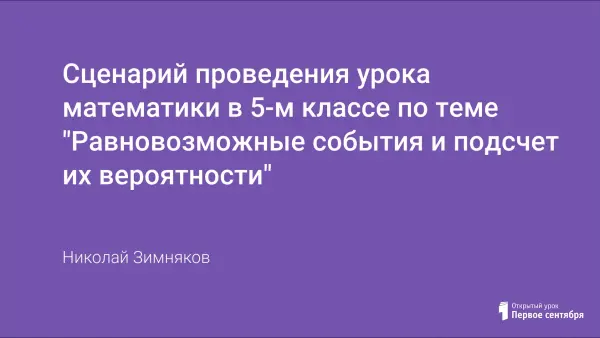 Урок знакомит учащихся 5-го класса с исходными понятиями теории вероятности: эксперимент, исход эксперимента, событие, достоверное событие, невозможное событие, возможное (случайное) событие, равновозможные события, определением вероятности события, задачами, связанными с определением вероятности.