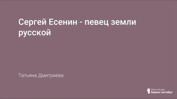 Сергей Есенин - певец земли русской. Знакомя учащихся с темой Родины лирике с С. Есениным, использую на уроке разные формы работы: беседа с классом, индивидуальные и групповые задания. На уроке звучат песни и романс на стихи Есенина. Благодаря лирике С. Есенина, словам М. Горького, Е. Евтушенко, М. Цветаевой, В. Астафьева, урок приобретает нравственно - эстетическое, патриотическое звучание.