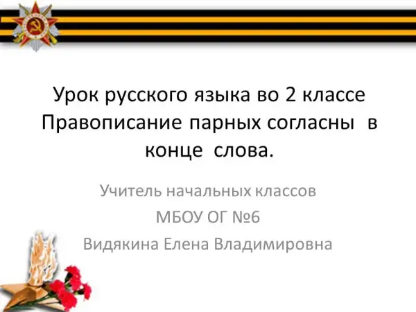 Представлена презентация к уроку русского языка во 2-м классе по теме «Правописание парных согласных в конце слова».