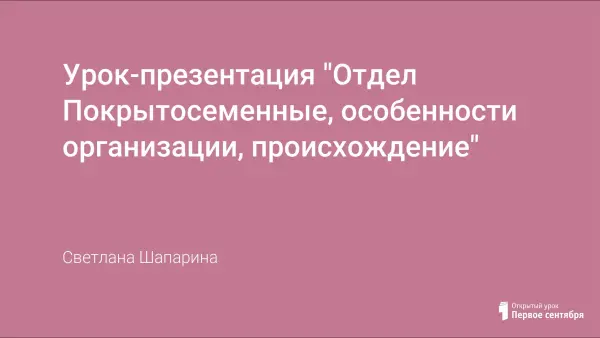 В работе представлена методическая разработка урока биологии в 7 классе по теме "Отдел Покрытосеменные, особенности организации, происхождение". Тип урока: урок-презентация с использованием компьютера в демонстрационном режиме.