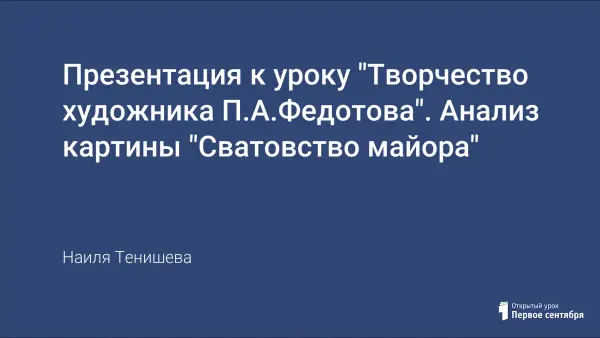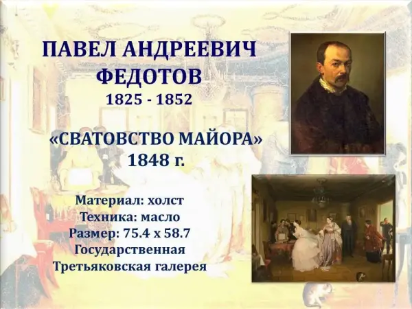 В октябре 1849 года Павел Федотов представил публике на выставке Академии художеств работу под названием «Поправка обстоятельств, или Сватовство», имевшую колоссальный успех. Впоследствии картина обзавелась и другими названиями – «Женитьба майора», «Приезд жениха», «Смотрины в купеческом доме», пока за ней не утвердилось ее нынешнее название. История создания полотна по-своему примечательна. В поисках героев и подходящего интерьера для этой картины Федотов обошел весь Петербург – он хотел достичь максимальной достоверности.