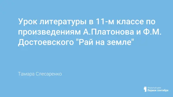 Урок литературы в 11-м классе "Рай на земле" на основе творчества А.Платонова и Ф.Достоевского способствует формированию у учащихся своей точки зрения на существование категории рая на земле, учит находить решение стоящих перед ними задач, способствующих развитию общечеловеческих ценностей и гражданского долга.