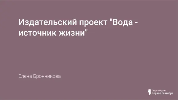 Издательский проект "Вода - источник жизни" содержит цикл занятий для детей старшего дошкольного возраста. Он предназначен для студентов педагогических колледжей, воспитателей дошкольных учреждений, а также всех, кого волнуют проблемы экологического воспитания подрастающего поколения. В данной работе представлены несколько занятий проекта.