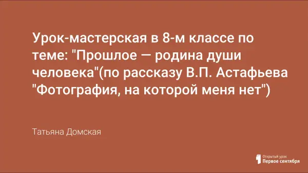 Урок-мастерская в 8-м классе по рассказу В. П. Астафьева "Фотография, на которой меня нет". Урок рассчитан на 2 часа и предполагает на основе домашнего чтения анализ текста рассказа на уроке (групповые задания), а также обращение к семейному прошлому учащихся (через старые фотографии, воспоминания родителей, семейные реликвии).