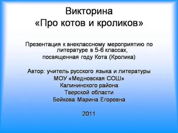 Игра рассчитана на учащихся 5–6-х классов и посвящена году Кота (Кролика). Однако символы китайского календаря здесь играют весьма незначительную роль. Они только дают повод рассмотреть, в каких литературных произведениях встречаются коты, кролики и зайцы. Что с ними происходит? Какую роль они играют в произведении? Вопросы викторины охватывают большое количество произведений, ставших классикой детской литературы.