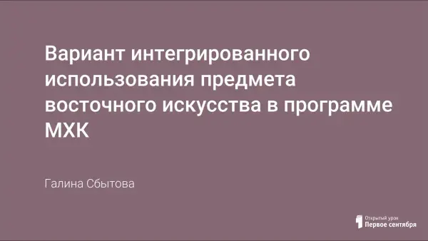Вариант интегрированного использования предмета восточного искусства в программе МХК предполагает знакомство с иной культурой не только как освоение опыта, но и как средство, помогающее углубленно всмотреться в свою культуру, понять ее особенности и проблемы.