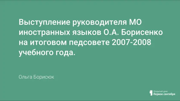 Данный материал представляет собой выступление руководителя МО иностранных языков Борисюк Ольги Анатольевны на итоговом педсовете за 2007-2008 учебный год. Это – отчет о работе МО иностранных языков за год. К составлению отчета автор подошел творчески, написав его в необычной литературной форме.