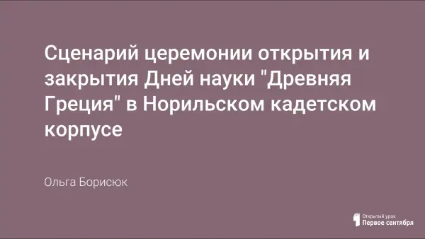 Данная работа представляет собой практическую разработку сценария церемонии открытия и закрытия "Дней науки" по теме "Древняя Греция" в Норильском кадетском корпусе г.Железногорска Красноярского края. Он обусловлен необходимостью изучения культуры Древней Греции, ставшей фундаментом европейской культуры. Данная разработка, представляя собой удачное сочетание знаний, интереса, фантазии и творчества, может явиться импульсом к самостоятельному литературному творчеству кадет.