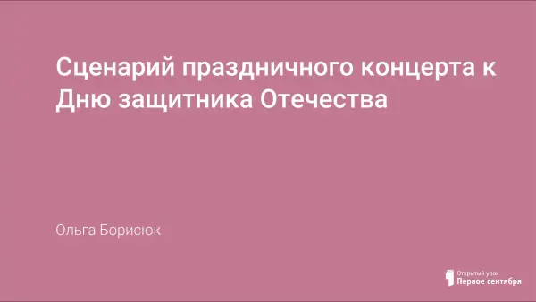 Работа представляет собой пошагово разработанный сценарий праздничного концерта к Дню Защитника Отечества. Сценарий может быть осуществлен силами учеников среднего и старшего звена средних школ, кадетских корпусов.