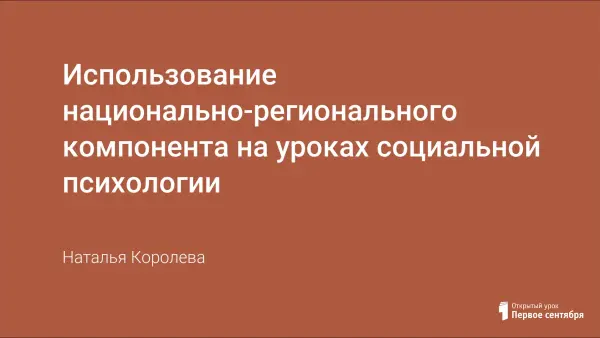 Учебная дисциплина "Социальная психология" является составной частью общепрофессиональной подготовки будущего учителя начальных классов и направлена на изучение теории общения, психологии социальных групп, социализации ребенка, социальной виктимологии, социальной психологии в образовании, а также на саморазвитие и самосовершенствование личности студента. Мы рассматриваем использование национально-регионального компонента на уроках социальной психологии.