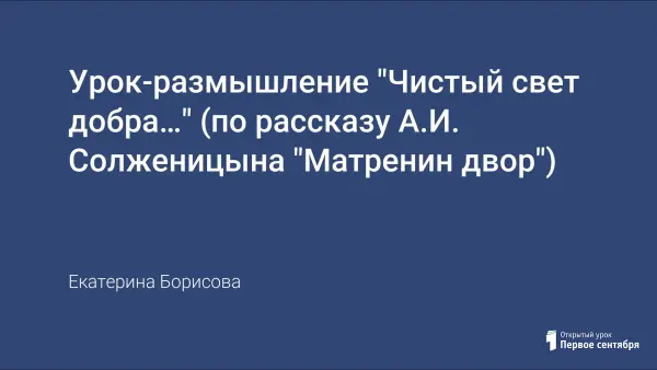Предлагаю описание урока-размышления "Чистый свет добра…" по рассказу Александра Исаевича Солженицына "Матренин двор". Урок поможет учащимся задуматься над такими нравственными понятиями как доброта, милосердие, чуткость, человечность, совесть; задуматься над смыслом жизни человеческой.
