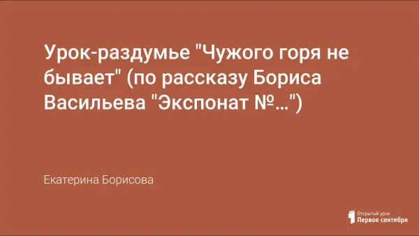 Урок внеклассного чтения "Чужого горя не бывает" по рассказу Бориса Васильева "Экспонат №...". Данный урок - раздумье поможет учащимся задуматься над такими нравственными понятиями как доброта, милосердие, чуткость, человечность; воспитывает патриотические чувства, нравственность, доброе отношение к людям через память о погибших; заставляет задуматься над смыслом жизни человеческой.