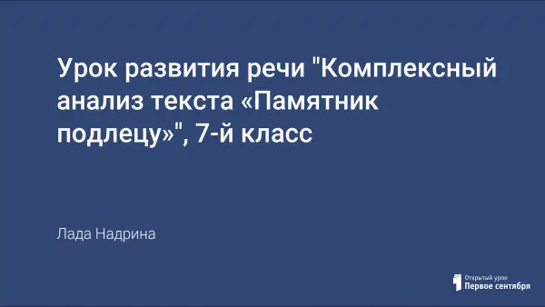 На уроке развития речи в 7-м классе по теме ''Комплексный анализ текста ''Памятник подлецу'' особое внимание уделяется работе с текстом, развитию и совершенствованию речемыслительной деятельности, коммуникативных и аналитических навыков, воспитанию гражданственности. На уроке исходный текст подвергается поэтапному анализу.