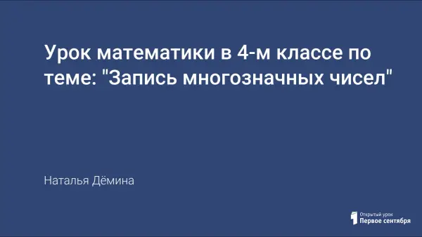 Представленный урок знакомит учащихся с записью и чтением многозначных чисел. Для успешной реализации поставленной цели используются приемы коллективной и парной работы. Учащиеся сами составляют алгоритм записи многозначных чисел, обсуждая его сначала в группах, а затем предлагают для обсуждения всему классу.