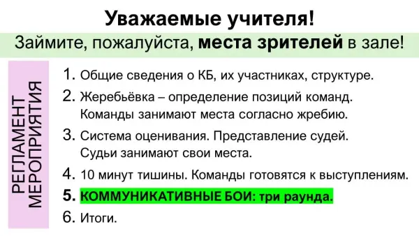 В статье представлен сценарий коммуникативных боёв «ФПЦ (фронтально-парные циклы) мешают/помогают достижению образовательных результатов» с сопровождающей их презентацией. КБ были успешно проведены в МОБУ «СОШ № 2» г.Минусинска Красноярского края 15 апреля 2025 года на Едином методическом дне «Через речь к мышлению». Участники КБ: учителя, администрация школы, специалисты в динамичной форме обсудили плюсы и минусы технологии ФПЦ.
