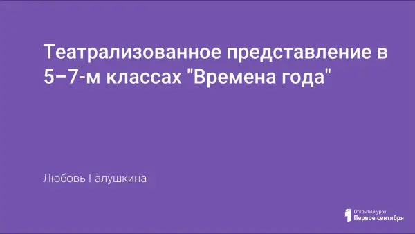 Театрализованное представление "Времена года" организовано для учащихся 5–7-х классов, для того чтобы активизировать их знания и умения по английскому языку, объединить учеников различных возрастных групп с разным уровнем знаний английского языка в совместной творческой работе, расширить их языковой запас, используя английские песни, стихи, сценки.