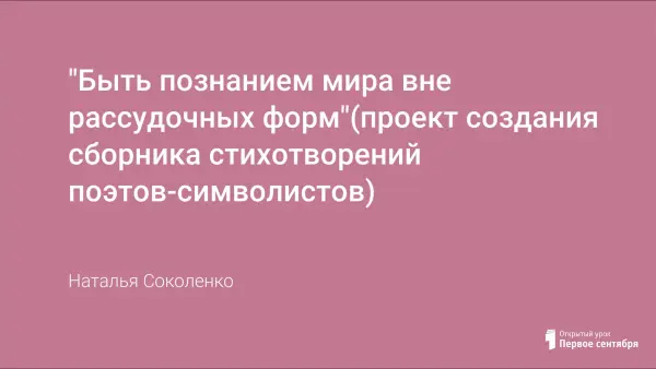 Проект создания сборника стихотворений поэтов-символистов.Внедрение развивающих технологий на основе метода проекта позволяет создать ситуацию успеха у детей с различным уровнем понимания этой сложной темы и проявить таланты в других областях. Кроме того, предисловие эквивалентно сочинению, поэтому может считаться итоговой проверочной работой по теме.