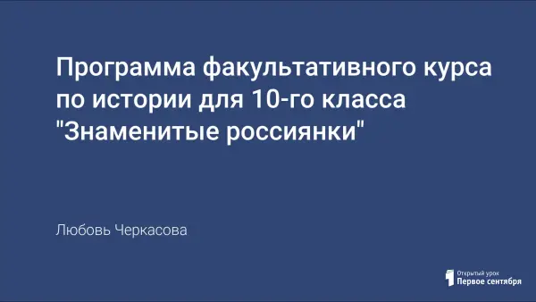 Вглядываясь в историческое прошлое, мы видим в нем женщин-правительниц, воительниц, дипломатов, художниц, актрис. Факультативный курс "Знаменитые россиянки X - XVIII вв. помогает оживить имена наших соотечественниц, представляя величие и самобытность их судеб, яркость силуэтов, цельность характеров.