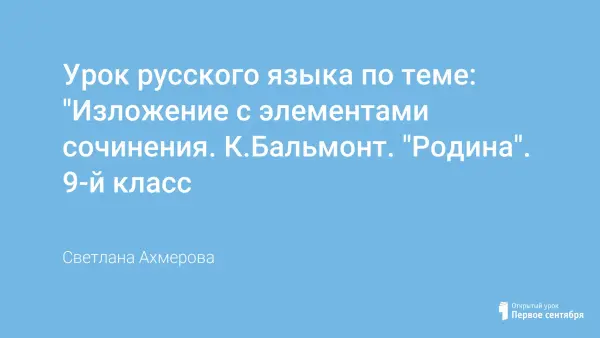 Урок русского языка в 9-м классе - это творческая работа. Строится она на базе замечательного текста русского поэта Серебряного века К.Бальмонта, яркость, живость и неповторимость которому придают пейзажные зарисовки, метафоричность языка. Выразительные средства языка помогут учащимся точно изложить авторскую мысль, проникнуться чувством "беспредельной любви" к своей родине. Бесспорно воспитательное значение отрывка. Методика урока - это групповая форма работы, индивидуальная, коллективная. Все виды деятельности учащихся на уроке подчинены одной цели - максимально проявить свои творческие способности при написании изложения с элементами сочинения.
