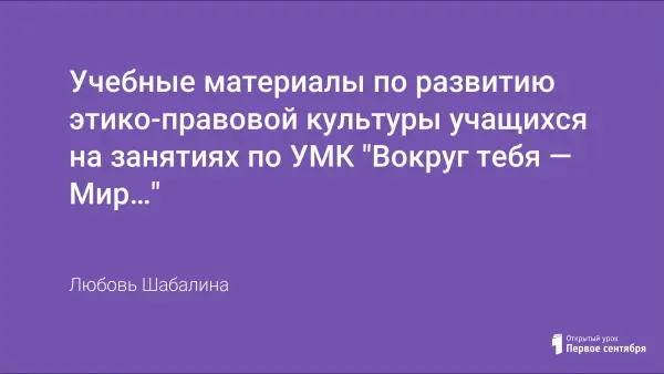 Предлагается учебный материал по развитию этико-правовой культуры учащихся по методическому комплекту "Вокруг тебя - Мир..." (авт. К. Сухарев-Дериваз и др.), который помогает успешному решению задач литературно-творческого развития учащихся и целенаправленному формированию личностных качеств, способствует приобщению учащихся к Международному гуманитарному праву.