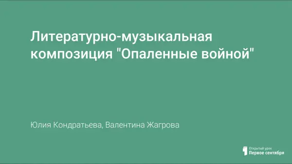 Литературно-музыкальная композиция для старшеклассников "Опаленные войной" посвящена 60-летию Победы советского народа в Великой Отечественной войне и выводу ограниченного контингента советских войск из Республики Афганистан. Внеклассное мероприятие способствует нравственно-патриотическому воспитанию учащихся.