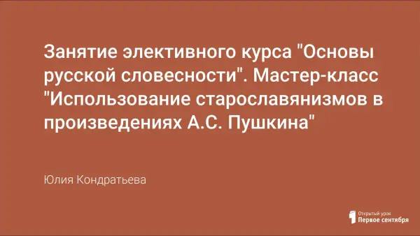 Занятия элективного курса реализуют задачу сблизить преподавание русского языка и литературы, показать литературные произведения как творения словесного искусства, увидеть и раскрыть их богатейшее содержание и художественное совершенство "посредством тщательного анализа самой словесной ткани литературного произведения". На уроке учащиеся определяют место и роль славянизмов в творчестве А.С. Пушкина.