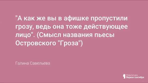 Предлагаемый урок является частью сложившейся у меня системы изучения драматических произведений. Урок раскрывает умение Н.А. Островского универсально реализовать метафору грозы в своей пьесе и подготавливает учеников к домашнему сочинению по теме: "Смысл названия пьесы Островского "Гроза".