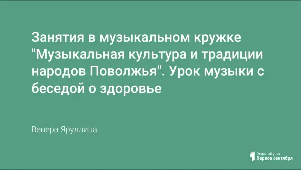В последнее время большинство учебных заведений ставят одной из первоочередных задач формирование у детей и подростков толерантного сознания, в частности терпимости к культуре и жизни других народов. И поэтому, целесообразно и доступно - привить интерес к своему народу и к другим народам Поволжья (культуре, быту) через кружок "Музыкальная культура и традиции народов Поволжья", так как между музыкой народов мира нет не переходимых границ. Музыку не надо переводить. Она способна дойти до сердца каждого. Материал состоит из кружковых занятий "Музыкальная культура и традиции народов Поволжья". Урок музыки с беседой о здоровье и вреде никотина.