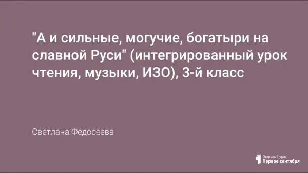 Опора на принципы взаимодействия и интеграции внутри художественного цикла позволила объединить уроки чтения, музыки и изобразительного искусства. Интегрированный урок "А и сильные, могучие богатыри на славной Руси" имеет цель создать целостный литературно-художественный образ народного героя - богатыря, показав его в творчестве художника, композитора, прочитав сказку "Никита Кожемяка".