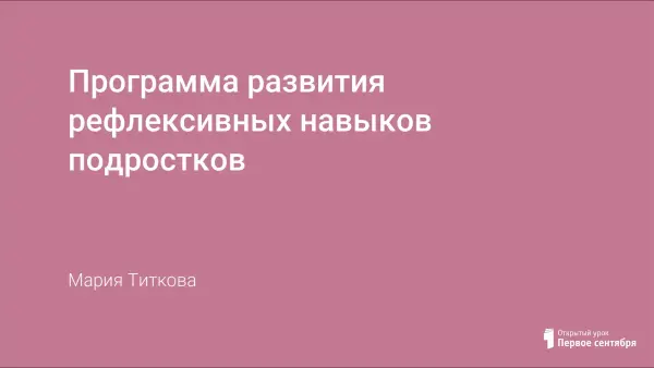Существует множество программ и тренингов, в которых один из этапов занятия - рефлексия (обсуждение итогов занятия). Данная же программа для 6-7-х классов направлена на развитие рефлексивных навыков в течение всего занятия. Цели программы: расширение знаний о себе и других людях, развитие рефлексивных навыков, уверенности в себе, развитие критического мышления. В результате занятий учащиеся повышают свою психологическую культуру, позитивное самоотношение, способность к рефлексии.