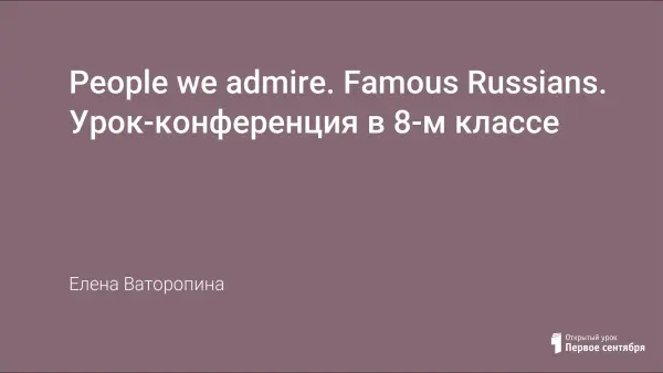Урок-конференция в 8-м классе посвящен знакомству с биографией и творчеством некоторых знаменитых деятелей российской науки и культуры. Воспитывает в школьниках патриотизм, любовь к своей Родине, гордость за нее, позволяет расширить содержание обучения английскому языку в общеобразовательных учреждениях, т.к. включает в себя изучение тем из других школьных предметов: литературы, истории, химии, МХК. На уроке используются результаты исследовательской и проектной деятельности.