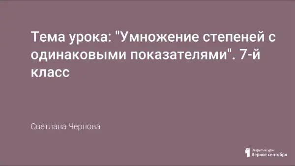 В статье представлен урок алгебры в 7-м классе для учащихся с низкими реальными учебными возможностями по теме "Умножение степеней с одинаковыми показателями". На уроке у учащихся формируется умение умножать степени с одинаковыми основаниями. Представлены задания, позволяющие проверить, насколько учащийся понял и научился применять новые знания.