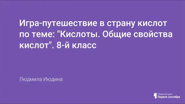 Постоянное стремление к совершенствованию урока, как одной из главных форм организации учебно-воспитательного процесса, отход от стандарта, шаблона, понимания того, что урок - это по особому организованные 45 минут - все это стимулирует и вдохновляет на поиски оригинальных подходов к изучению программного материала. Хотелось бы в связи с этим поделиться со своими коллегами опытом проведения таких уроков, как игра-путешествие в страну кислот.
