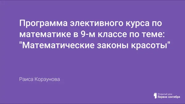В окружающем мире прекрасное сложно и многообразно. Восприятие красоты предполагает знакомство с её простейшими, первичными элементами. Элективный курс «математические законы красоты» должен стать непрерывным процессом воздействия на интеллект учащихся, на их волю, эмоции, эстетическое чувство и мораль. Такая постановка вопроса позволит ликвидировать кажущийся отрыв математики от реальности, поможет учащимся понять, что законы математики взяты из природы и объясняют природу. Кроме учебной цели достигаются и другие – воспитание эстетического вкуса, развитие элементов творчества.