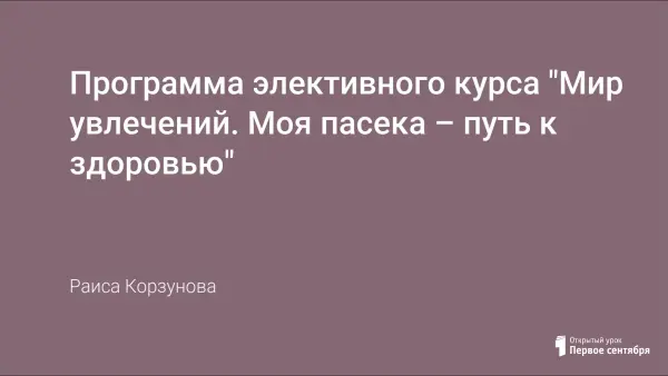 Курс предусматривает ознакомление подрастающего поколения с основами пчеловодства в домашних условиях, рассчитан на один год (34 часа).