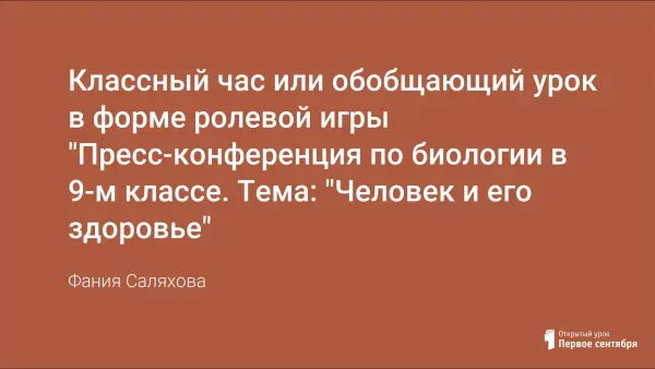Обобщающий урок по биологии в 9-м классе в форме ролевой игры. Игра задумана как пресс-конференция. Проведению игры предшествует специальная подготовка. Определяется круг вопросов, проблем , которые необходимо обсудить, намечается последовательность их рассмотрения.