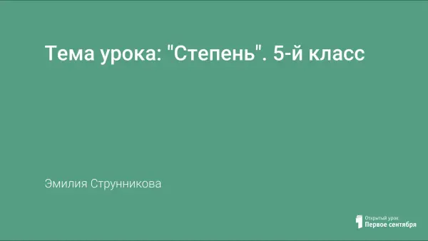 Урок математики в 5-м классе на тему: "Степень" по учебнику С.М. Никольского, М.К. Потапов, Н.Н. Решетников, А.В. Шевкин. Арифметика. На уроке учитель работает над определением степени с натуральным показателем, и с выходом на формулы. Повторяется распределительный закон умножения, запись числа через разрядные единицы. Используется пример с картины "Устный счет" Богданова-Бельского. Предупреждается ошибка на отождествление умножения с возведением в степень.