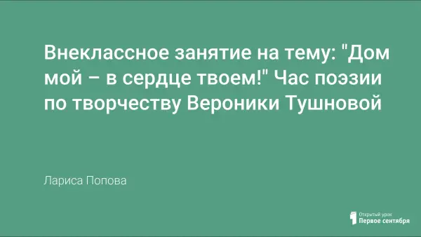 Цели занятия: формирование любви к поэзии, воспевающей и выражающей человеческие чувства, нравственную чистоту; работа с понятиями "счастье", "любовь", "природа"; воспитание интереса к творчеству Вероники Тушновой; семья как высшая ценность человеческой жизни; экология души, экология человеческих отношений, экология мира, в котором живем.