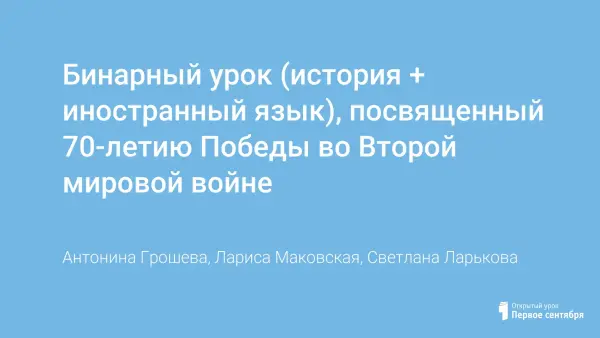 Бинарный урок по истории и иностранному языку, посвященный 70-летию Победы в Великой Отечественной – Второй Мировой войне, разработан в форме практического занятия. Урок направлен на формирование уважения к старшему поколению, интереса студентов к боевому прошлому нашей страны - СССР и стран-союзников, Великобритании и США. Развитие исторических и языковых компетенций студентов достигается через использование информационных технологий.