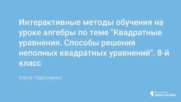 Урок применяет интерактивные методы обучения, такие, как ассоциативный ряд, самостоятельный анализ, работа в группах, самостоятельная формулировка определений, составление кластера. Цель занятия: познакомить учащихся с общим видом квадратного уравнения, понятием "неполное квадратное уравнение" и способами их решения, показать, что источник возникновения квадратных уравнений – реальный мир, что эти уравнения возникли из практических потребностей людей.