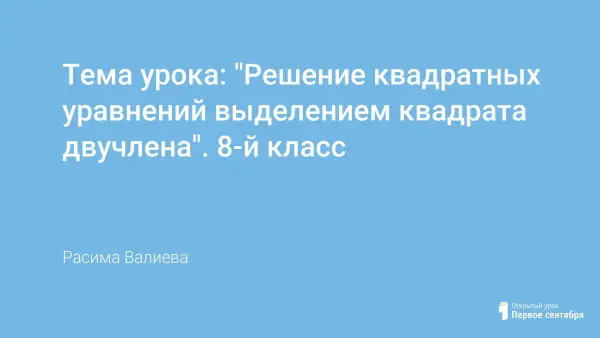Урок алгебры осваивает способ выделения квадрата двучлена из квадратного трехчлена, заданного в стандартном виде; решать квадратное уравнение способом выделения квадрата двучлена. Урок развивает познавательную активность, логическое мышление для сознательного восприятия учебного материала; воспитывает чувство ответственности и товарищества, навыки общения.